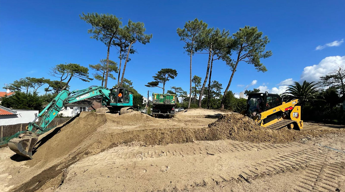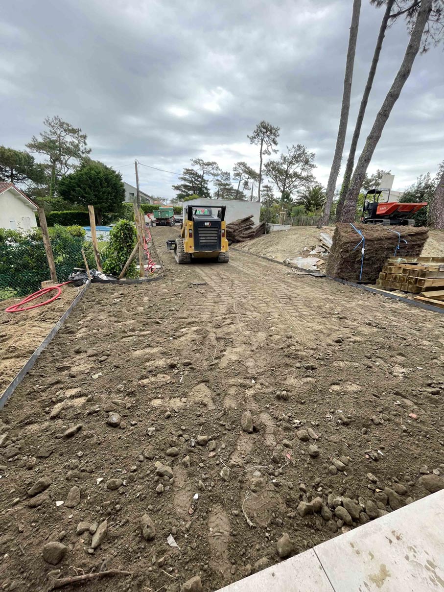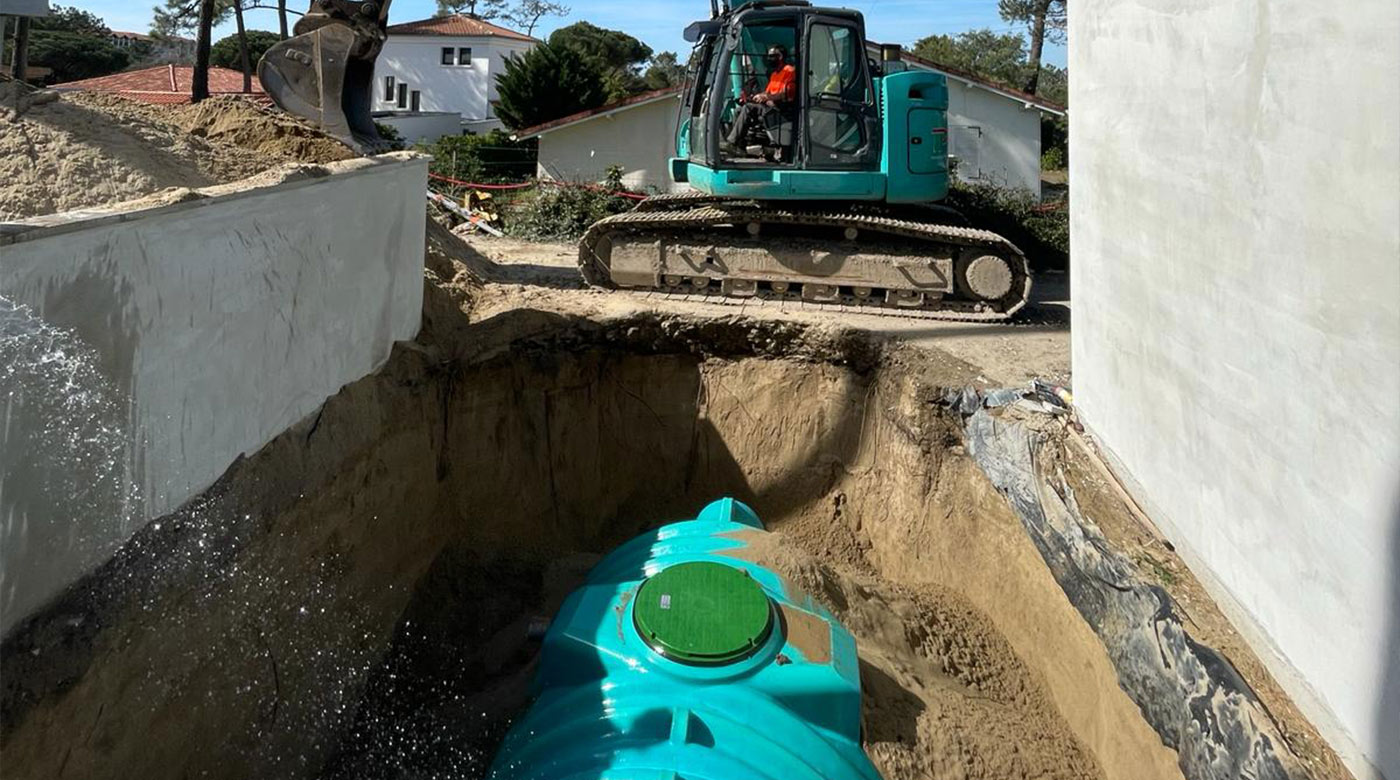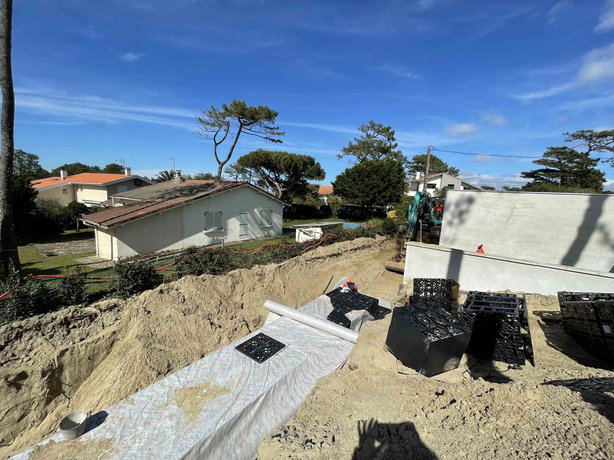 VILLA A CHIBERTA Réalisation d’une villa à Chiberta Terrassement Pose d’une cuve de récupération des eaux de pluies Réseaux EU et EP Réseaux secs Cheminement avec bordures acier Client: Particulier Lieu: Chiberta Category: EntrepriseTerrassementVRD